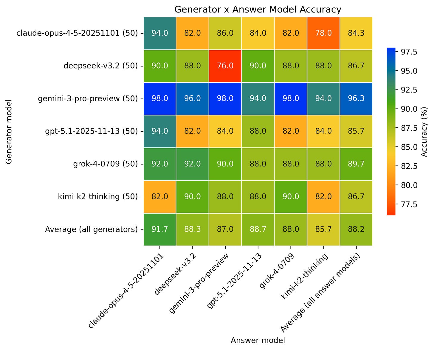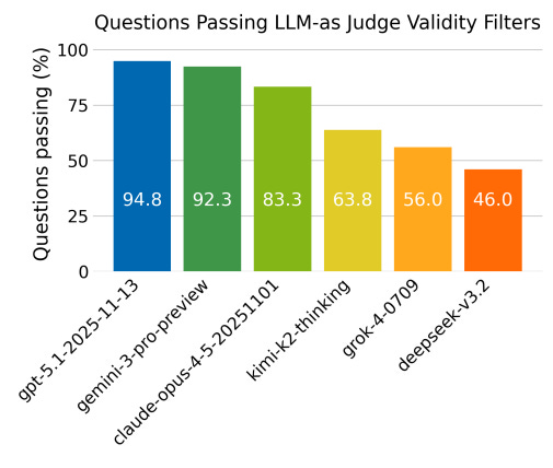 Quizzes are generated by each LLM using the latest top 6 SOTA families according to Artificial Analysis (cut-off date of 11/15/2025) OpenAI, XAI, Gemini, Kimi, DeepSeek, Anthropic reasoning models.