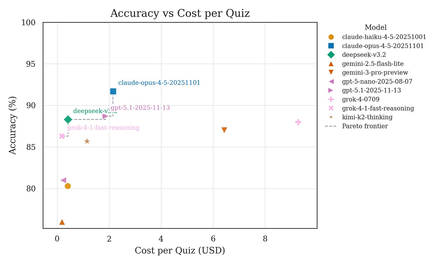 Figure 3. Accuracy vs Cost per Quiz and Pareto frontier.